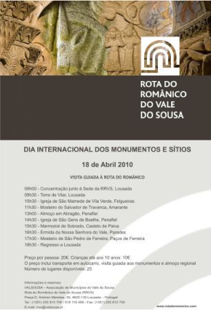 Dia 18 de Abril, a Rota do Românico do Vale do Sousa assinala o Dia Internacional dos Monumentos e Sítios através da dinamização de uma visita guiada, em autocarro, a sete dos seus elementos patrimoniais. A concentração está marcada para as 9 horas junto da sede da associação, na Lousada. O percurso inclui passagem na Torre de Vilar, na Igreja de São Mamede de Vila Verde, no mosteiro do Salvador de Travanca e almoço em Abragão. Ao início da tarde, visita à Igreja de São Gens de Boelhe, ao Marmoiral de Sobrado, na Ermida da Nossa Senhora do Vale e Mosteiro de São Pedro de Ferreira. Incluído no programa está um almoço regional.