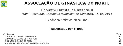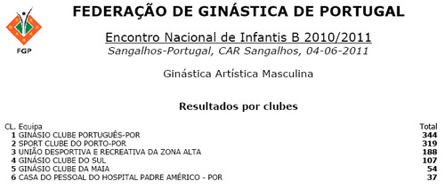 As classificações individuais e por equipas, relativas à Ginástica Artística Feminina e Masculina, poderão ser consultadas em http://gimnojunior2011.webnode.pt/.
